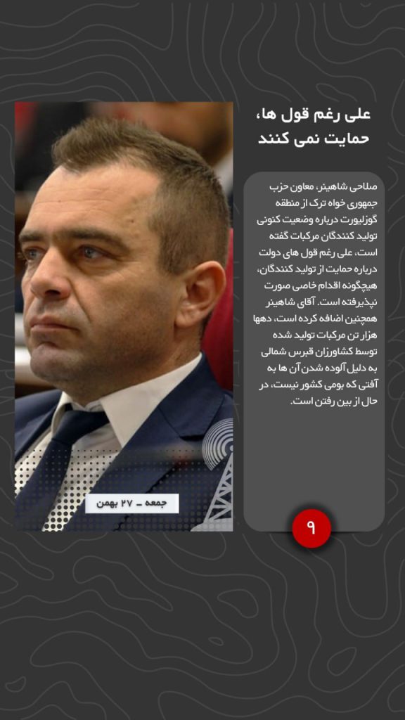 صلاحی شاهینر، معاون حزب جمهوری خواه ترک از منطقه گوزلیورت درباره وضعیت کنونی تولید کنندگان مرکبات گفته است، علی رغم قول های دولت درباره حمایت از تولید کنندگان، هیچگونه اقدام خاصی صورت نپذیرفته است. آقای شاهینر همچنین اضافه کرده است، دهها هزار تن مرکبات تولید شده توسط کشاورزان قبرس_شمالی به دلیل آلوده شدن آن ها به آفتی که بومی کشور نیست، در حال از بین رفتن است.