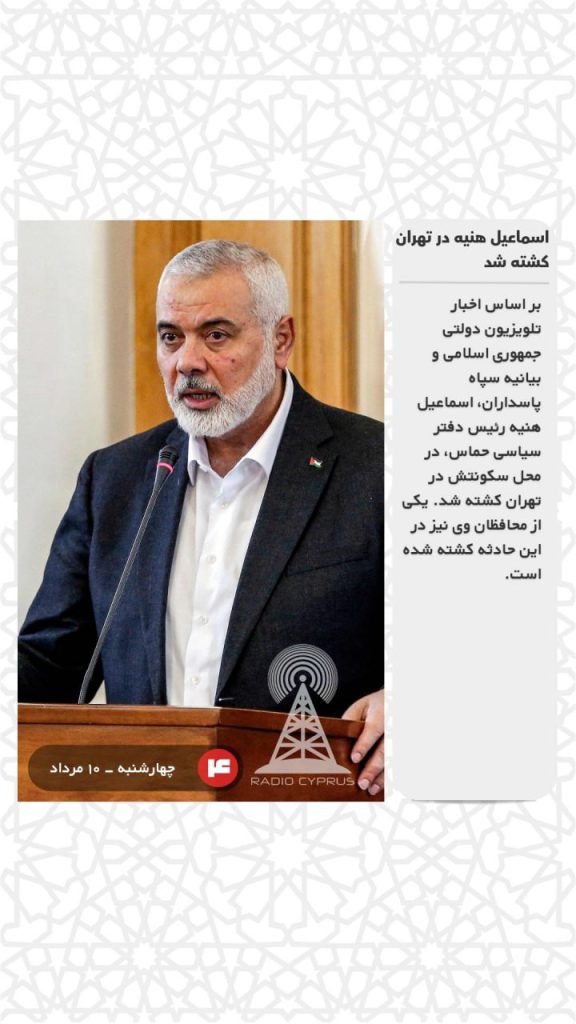 بر اساس اخبار تلویزیون دولتی جمهوری اسلامی و بیانیه سپاه پاسداران، اسماعیل هنیه رئیس دفتر سیاسی حماس، در محل سکونتش در تهران کشته شد. یکی از محافظان وی نیز در این حادثه کشته شده است.