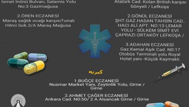 لفکوشا: GÖNÜL ECZANESİ ŞHT.GAZ.HASAN TAHSİN CAD.. HACI ALİ APT. NO:13 LEMAR YOLU – SÜLKEM SİMİT EVİ ÇAPRAZI ORTAKÖY LEFKOŞA ۰۳۹۲…