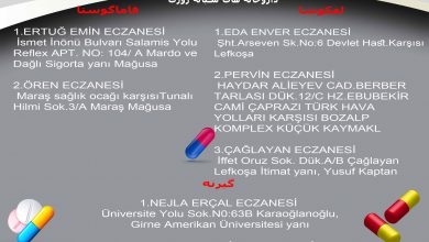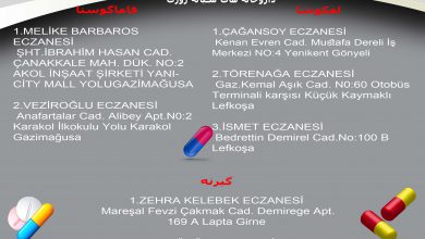 لفکوشا: EDA ENVER ECZANESİ Şht.Arseven Sk.No:6 Devlet Hast.Karşısı Lefkoşa ۰۳۹۲۲۲۳۴۸۱۰ *** PERVİN ECZANESİ HAYDAR ALİEYEV CAD.BERBER TARLASI DÜK.12/C HZ.EBUBEKİR CAMİ…