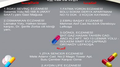 لفکوشا: AKDORA ECZANESİ MUMCU TEPE SOKAK BOZHAN APT. NO:4 ANITTEPE YOLU HAMİTKÖY ۰۳۹۲۲۲۵۳۳۵۵ SEVAL KAYMAK ECZANESİ Prof.Dr.Necmettin Erbakan Cad. Domuzcular…