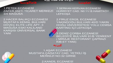 لفکوشا: SERKAN KERVAN ECZANESİ HÜRRİYET CAD. N0:11/ B HAMİTKÖY LEFKOŞA ۰۳۹۲ ۲۲۵ ۸۰ ۹۱ FİRUZ ERGİL ECZANESİ YAKINDOĞU BULVARI 40/D…