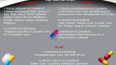 لفکوشا: TÜRKAN ŞENTİP ECZANESİ ۳۸/۵/ Hacı Ali Apt. Öğretmenler Cad. Ortaköy Lefkoşa ۰۳۹۲۲۲۳۹۳۴۰ *** GÜLİZAR ÖZTEKNİK ECZANESİ Şht. Mustafa Ruso…
