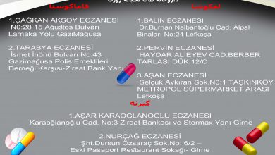 لفکوشا: BALIN ECZANESİ Dr.Burhan Nalbantoğlu Cad. Alpal Binaları No:24 Lefkoşa ۰۳۹۲ ۲۲۳ ۱۸ ۱۳ *** PERVİN ECZANESİ HAYDAR ALİEYEV CAD.BERBER…