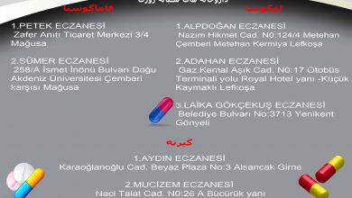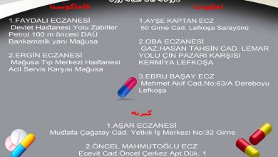 لفکوشا: ALPDOĞAN ECZANESİ Nazım Hikmet Cad. N0:124/4 Metehan Çemberi Metehan Kermiya Lefkoşa ۰۳۹۲۳۳۰۱۰۳۶ *** ADAHAN ECZANESİ Gaz.Kemal Aşık Cad. N0:17…