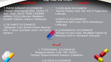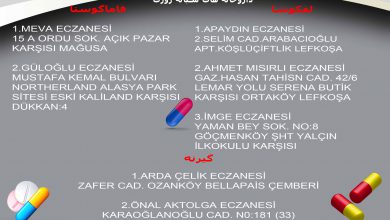 لفکوشا: KIZILBAŞ ECZANESİ Kemal Aksay Cad. No: 43/ 2 Taşkınköy Lefkoşa ۰۳۹۲۲۲۵۳۲۵۹ *** DERYA ECZANESİ Mehmet Akif Cad. 53/3 Dereboyu…