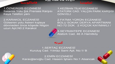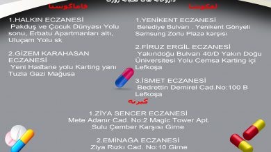 لفکوشا: YENİKENT ECZANESİ Belediye Bulvarı . Yenikent Gönyeli Samsung Zorlu Plaza karşısı ۰۳۹۲ ۲۲۳ ۹۳ ۷۸ *** FİRUZ ERGİL ECZANESİ…