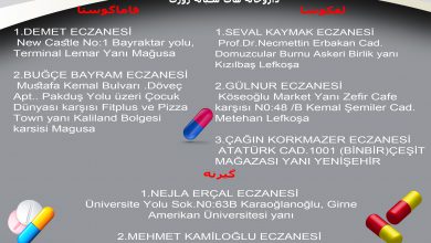 لفکوشا: SEVAL KAYMAK ECZANESİ Prof.Dr.Necmettin Erbakan Cad. Domuzcular Burnu Askeri Birlik yanı Kızılbaş Lefkoşa / Lefkoşa ۰۳۹۲۲۲۷۹۶۱۹ GÜLNUR ECZANESİ Köseoğlu…