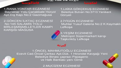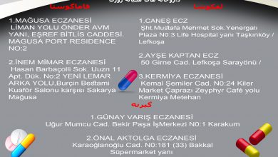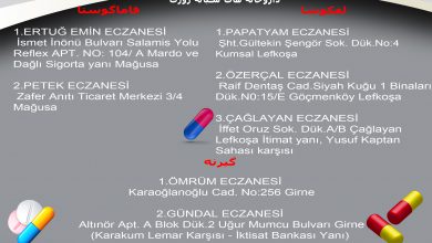 لفکوشا: TÖRENAĞA ECZANESİ Gaz.Kemal Aşık Cad. N0:60 Otobüs Terminali karşısı Küçük Kaymaklı Lefkoşa ۰۳۹۲۲۲۸۱۰۰۸ ۰۵۴۸۸۸۸۴۰۴۰ *** EBRU BAŞAY ECZANESİ Mehmet…