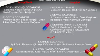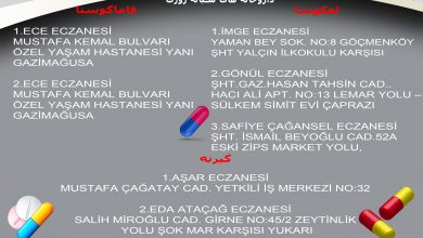 لفکوشا: ECEM ECZANESİ Bedrettin Demirel Cad.No: 127 Lefkoşa ۰۳۹۲۲۲۸۸۹۵۶ ۰۵۳۳۸۵۶۷۷۹۰ *** SEVAL ECZANESİ ۹ Yavuz Konnolu Sok. Özel Başkent Hastanesi…