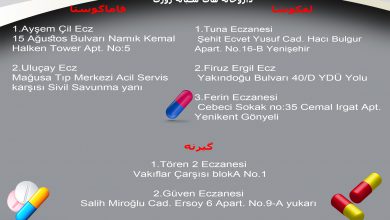 لفکوشا: Tuna Eczanesi Şehit Ecvet YusufCad. Hacı Bulgur Apart. No.16-BYenişehir Tel: 227 78 74 Firuz Ergil Ecz Yakındoğu Bulvarı۴۰/D YDÜ…