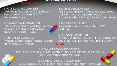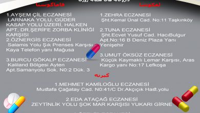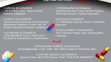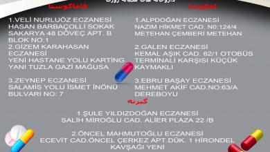 لفکوشا: ALPDOĞAN ECZANESİ NAZIM HİKMET CAD. N0:124/4 METEHAN ÇEMBERİ METEHAN KERMİYA LEFKOŞA ۰۳۹۲۳۳۰۱۰۳۶ ۰۵۳۳۸۵۲۹۹۹۰ GALEN ECZANESİ KEMAL AŞIK CAD. 62/1…