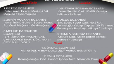 لفکوشا: YELİM ECZANESİ ARAÇ KAYIT DAİRESİ KARŞI YOLU MAMULCUOĞLU KARŞISI KEROS KURUTEMİZLEME YANI / Lefkoşa ۰۳۹۲۲۲۸۷۸۶۶ *** MUSTAFA GÜRMAN ECZANESİ…