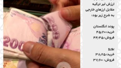 صبح امروز و با بازگشایی بازار، ارزش لیر ترکیه مقابل ارزهای خارجی به شرح زیر بود: پوند انگلستان خرید:۴۴.۷۰ فروش:۴۴.۱۰…