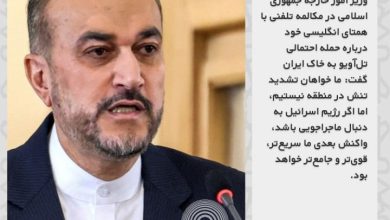 وزیر امور خارجه جمهوری اسلامی در مکالمه تلفنی با همتای انگلیسی خود درباره حمله احتمالی تلآویو به خاک ایران گفت:…